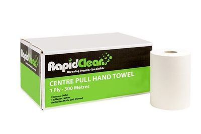 RapidClean Centre Pull Hand Towel is ideal for use in high consumption areas where light spills and general wiping is expected. Through coupling flexible dispending with high strength and fast absorbing paper, users can take as much or as little paper as required to perform a variety of tasks. Centre-feed dispensing makes roll changes quick and easy. Designed to fit all Centre Pull Towel dispensers on the market. Australian Made and Owned. 1 Ply, 20cm x 75cm sheet average (1600 sheets), 200mm x 300m roll,