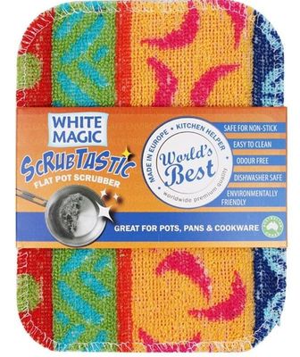 The White Magic Scrubtastic Flat Pot Schubber is constructed from 100% cotton with a non-toxic and environmentally friendly coating making it perfect to use for non-stick cookware, as well as pots and pans.