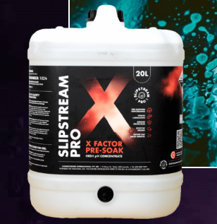 Cargroomers Slipstream Pro X Factor Pre Soak Concentrate provides high pH for neutralisation of acid, X Factor forms Phosphates (when used with acid) to improve detergency.
